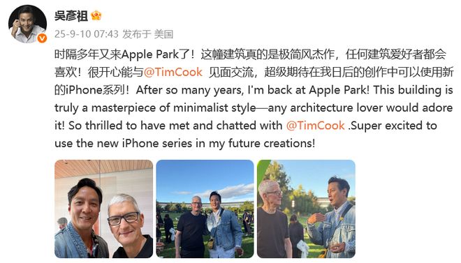 随后,库克转发吴彦祖微博回应:“很高兴在 Apple Park 见到你,Daniel!期待看到你用我们的新产品开启更多创意可能。”
